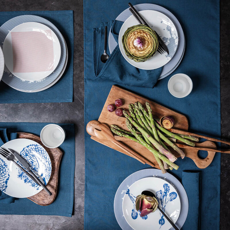 Szeroka paleta sześciu kolorów umożliwia stworzenie zarówno subtelnych, jak i efektownych kompozycji na stole – czy to do codziennych posiłków, czy na bardziej uroczyste spotkania. Vegetal Mood harmonijnie współgra z ceramiką, szkłem i naturalnymi dodatkami, dodając aranżacji botanicznego charakteru i relaksującego nastroju.