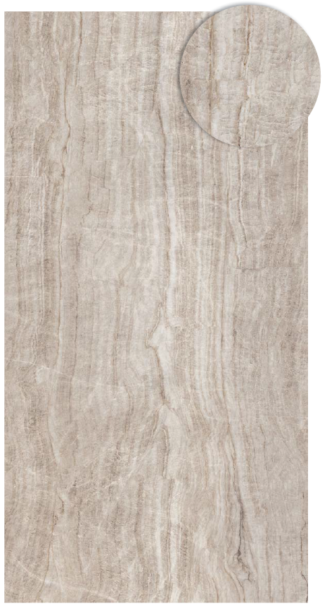 Blat porcelanowy ABK Stone Taj Mahal imituje brazylijski kwarcyt Taj Mahal, który ze względu na swoją wyrafinowaną elegancję i odporność jest używany przez architektów i projektantów wnętrz na całym świecie do tworzenia blatów kuchennych, stołów, powierzchni łazienkowych, wykładzin wewnętrznych i podłóg. Charakteryzuje się bursztynową barwą i półprzezroczystym tłem, co w połączeniu z graficzną fakturą przypomina strukturę szlachetnego onyksu.