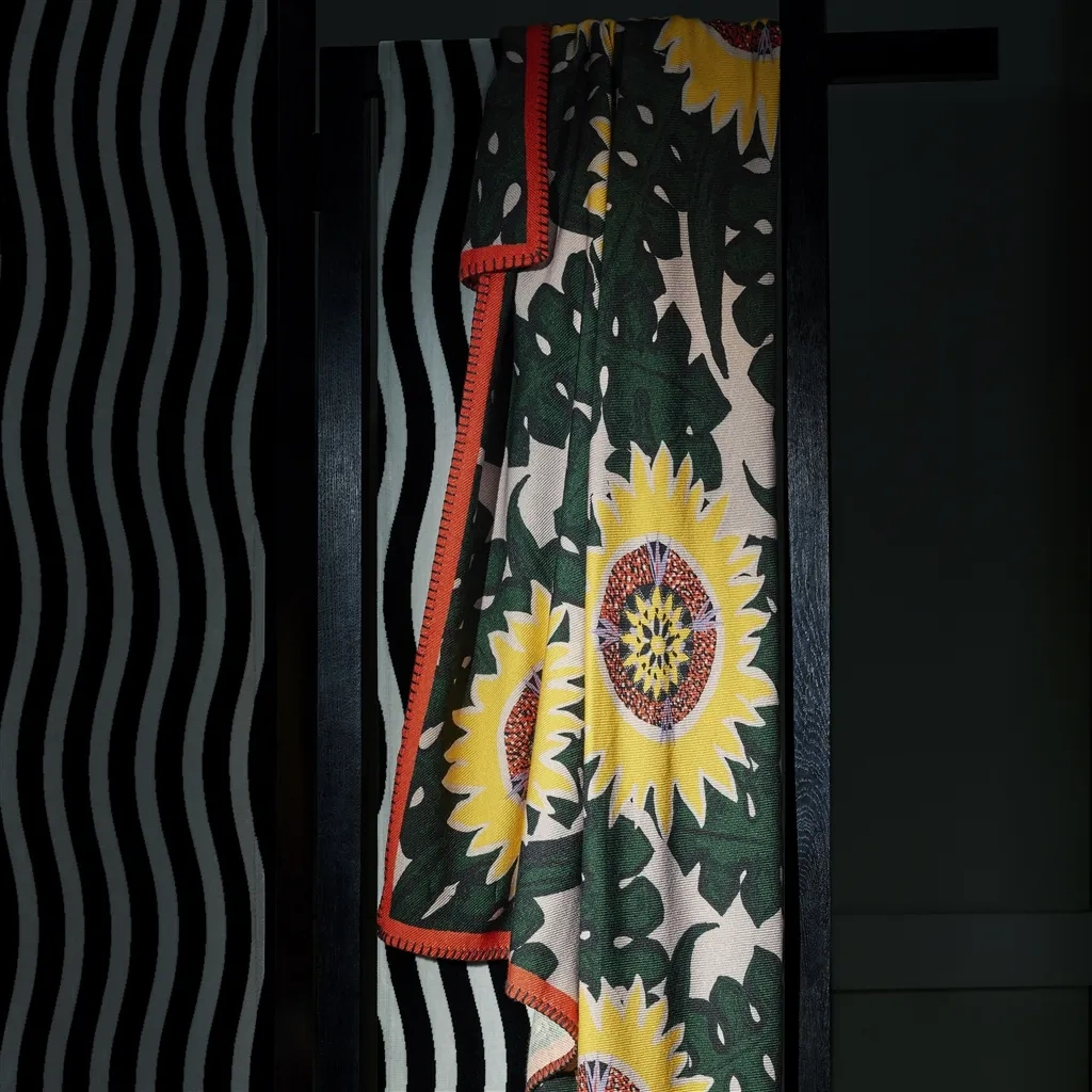 Dzięki żywym, graficznym motywom słoneczników, koc Soleils Osier stanowi doskonały dodatek do każdego wnętrza. Jego nowoczesny design i bogata kolorystyka ożywią każdy pokój, dodając mu charakteru i stylu. To idealny wybór dla tych, którzy cenią sobie połączenie funkcjonalności i artystycznego wyrazu.