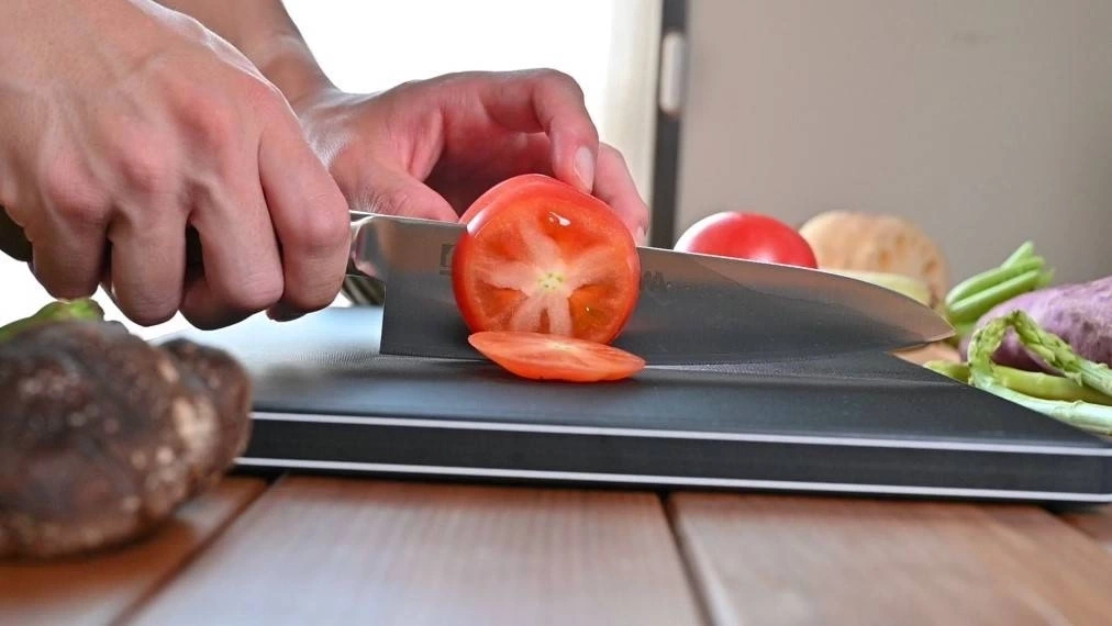 Deski do krojenia HASEGAWA z serii FRK dedykowane są przede wszystkim użytkownikom domowym. Tak jak w profesjonalnych produktach, jest to opatentowane połączenie rdzenia z drewna liściastego i elastomerowych okładzin na powierzchniach zewnętrznych. Miękki elastamer idealnie absorbuje uderzenia ostrych noży japońskich oraz przedłuża ich ostrość. Daje też lepszą przyczepność krojonych produktów, dzięki czemu kawałki jedzenia nie przesuwają się po desce, a cięcia są bardziej precyzyjne. Również waga pozostaje zmniejszona o 30-50% w stosunku do tradycyjnych desek drewnianych czy plastikowych.
