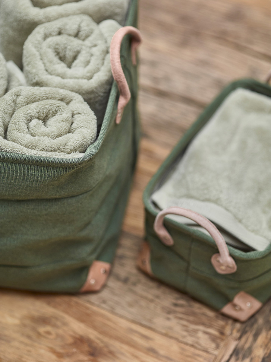 Organizer Lubin jest uniwersalny i pasuje do wnętrz urządzonych w różnych stylach. Praktyczne, skórzane uchwyty pomagają w przesuwaniu i przenoszeniu kosza, a skórzane rogi dodają uroku. Organizer wykonano z trwałego i łatwego w czyszczeniu materiału.