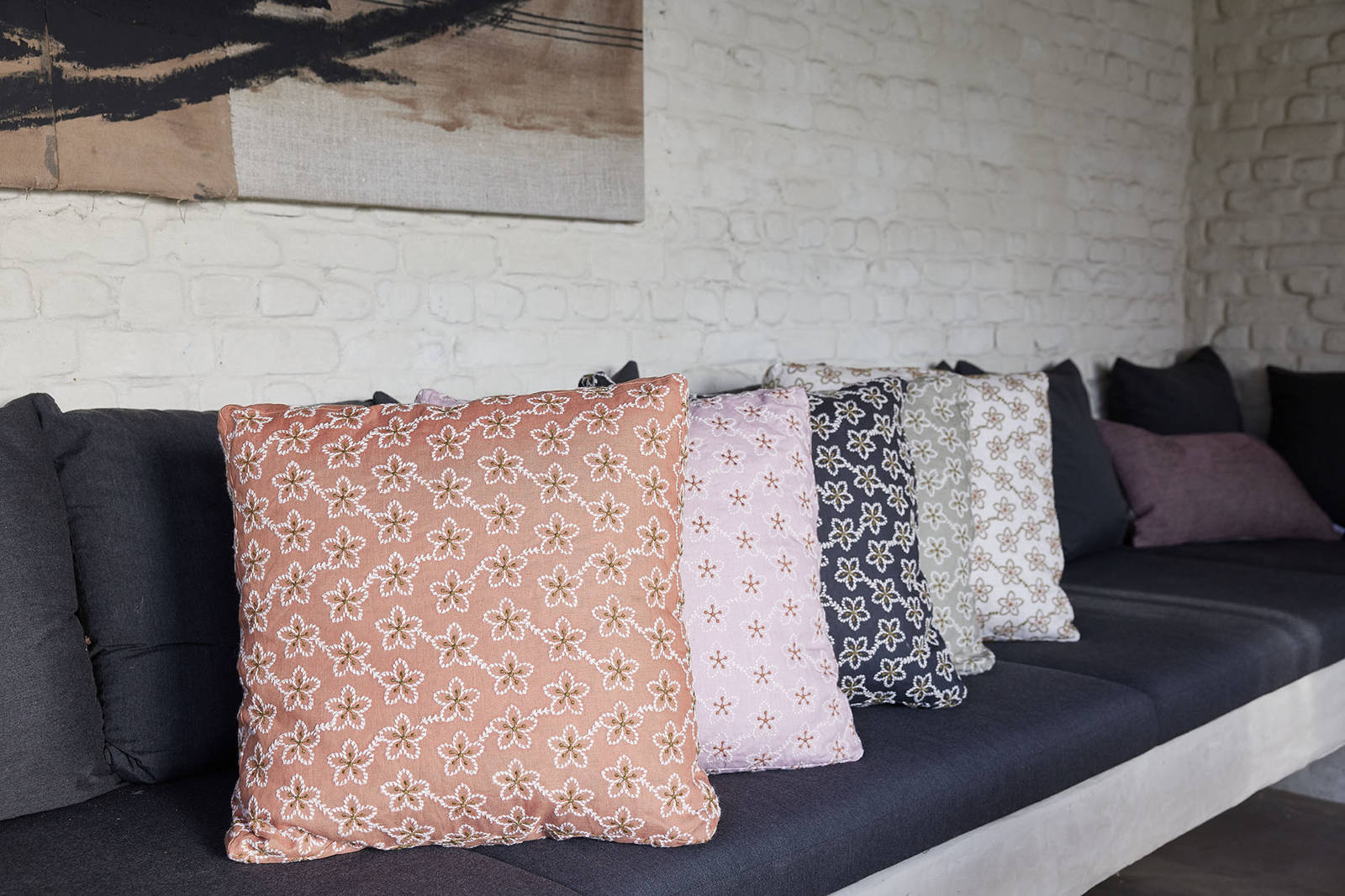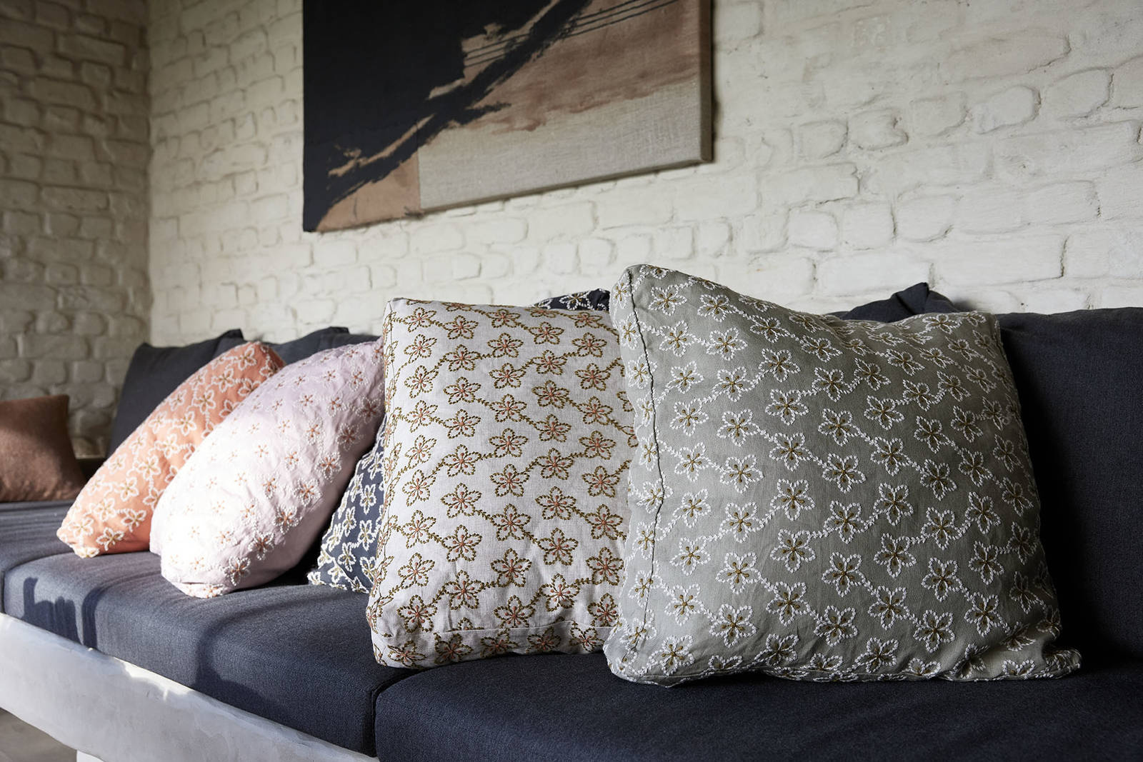 Kwiat śliwy, popularny w sztukach dekoracyjnych Dalekiego Wschodu, jest centralnym elementem tej poszewki. To wzór, który uchwycił istotę uroczego małego kwiatka, składającego się z pięciu wdzięcznych płatków i rzęsistych pręcików. Na poszewce Fleurs odtworzona została jego charakterystyczna sylwetka w postaci haftu. Zrobiony z włóczki wełnianej haft nadaje poszewce subtelności.