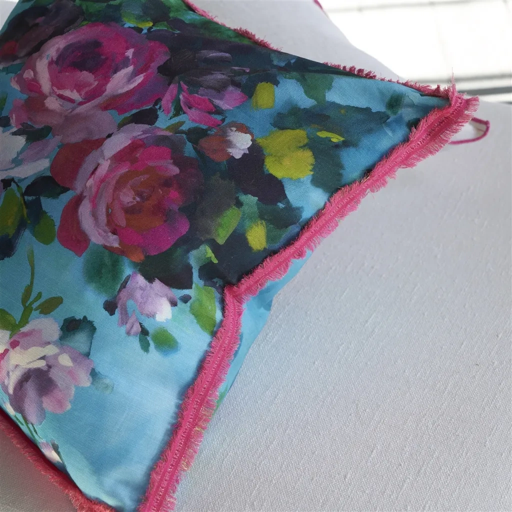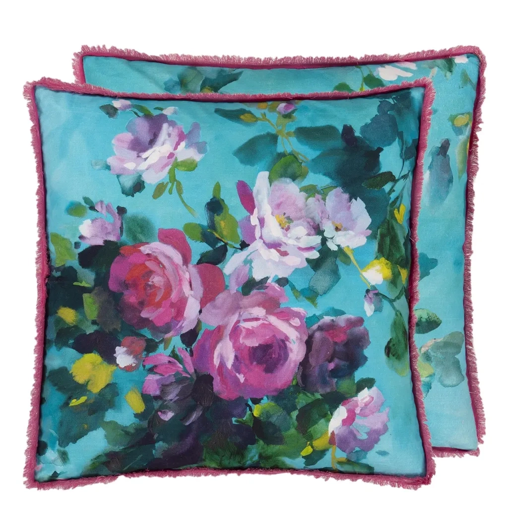 Jeśli pragniesz wprowadzić do swojego wnętrza kolorową eksplozję kwiatów to poduszka dekoracyjna Designers Guild Bouquet De Roses Turquoise jest idealnym wyborem. To wspaniała poduszka, na której przedstawiono malarskie wrażenie bukietów letnich róż w odcieniach magenty i fioletu na żywym turkusowym tle.
