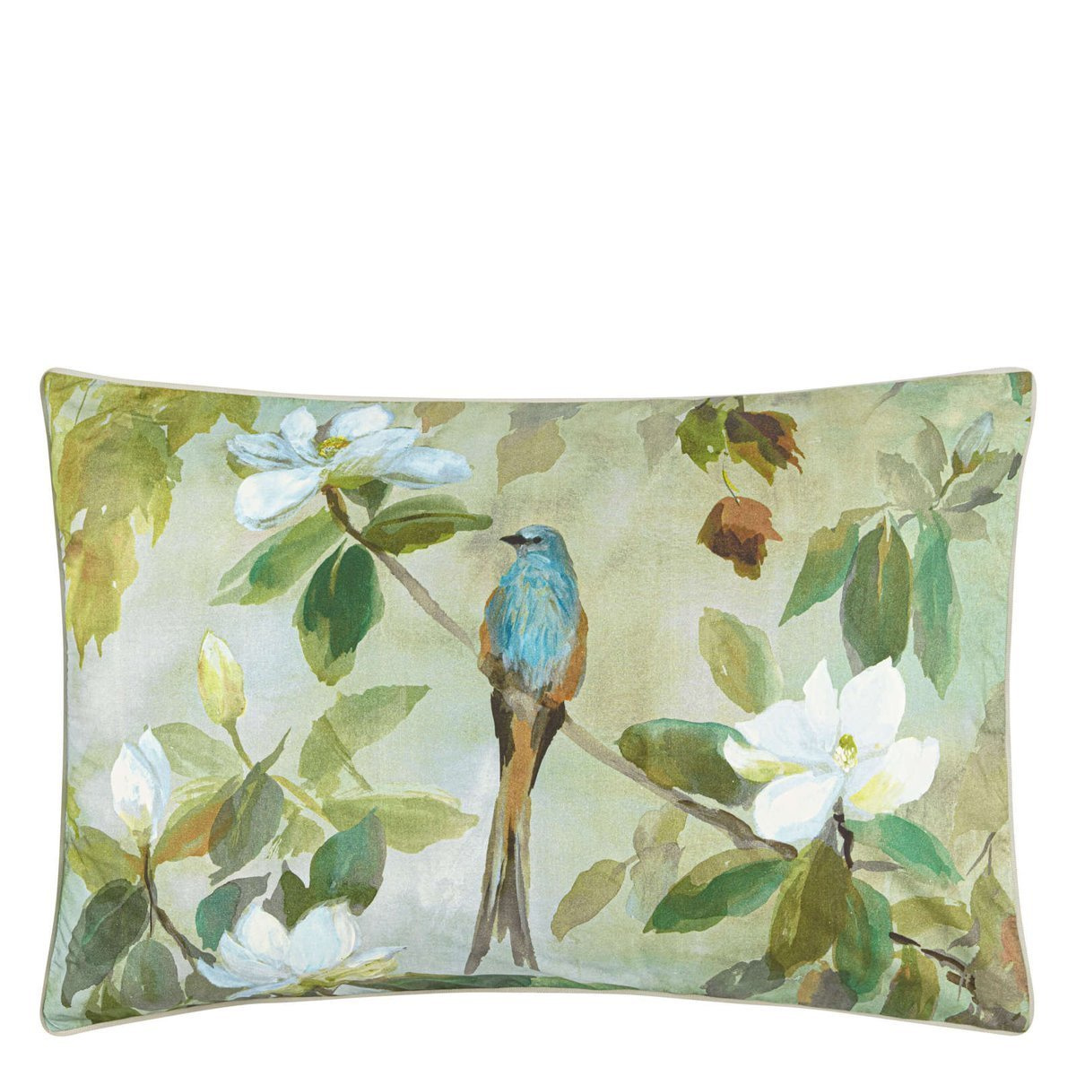 Malowane akwarelą liście i magnolie tworzą wspaniały wzór pościeli Maple Tree wydrukowany perkalowej tkaninie. Scenerię dodatkowo ożywiają przesiadujące na gałęziach ptaki.