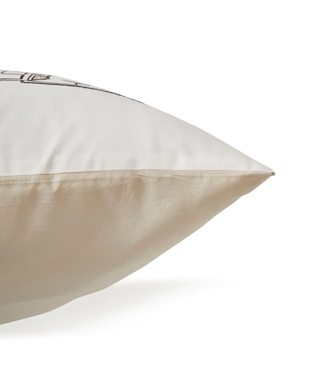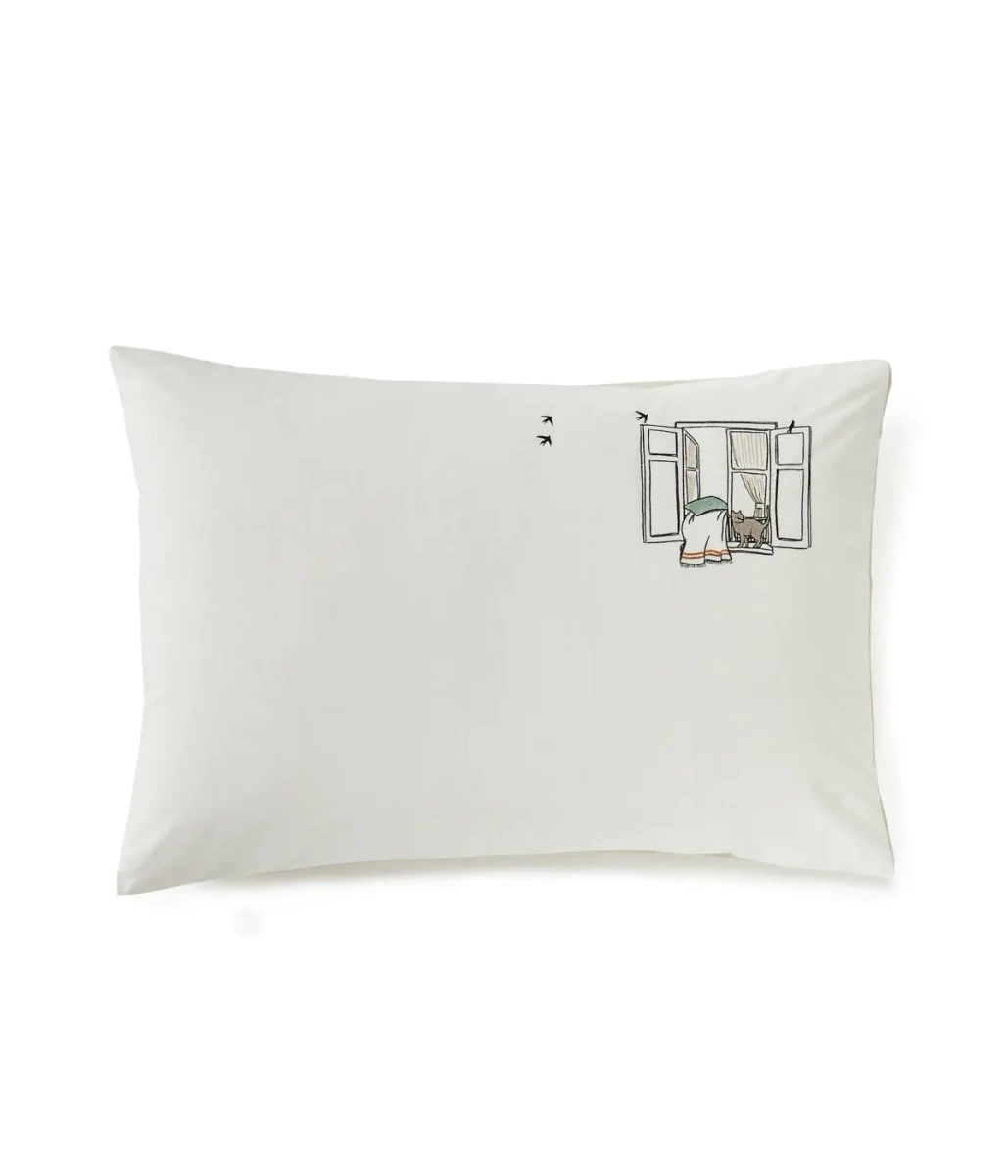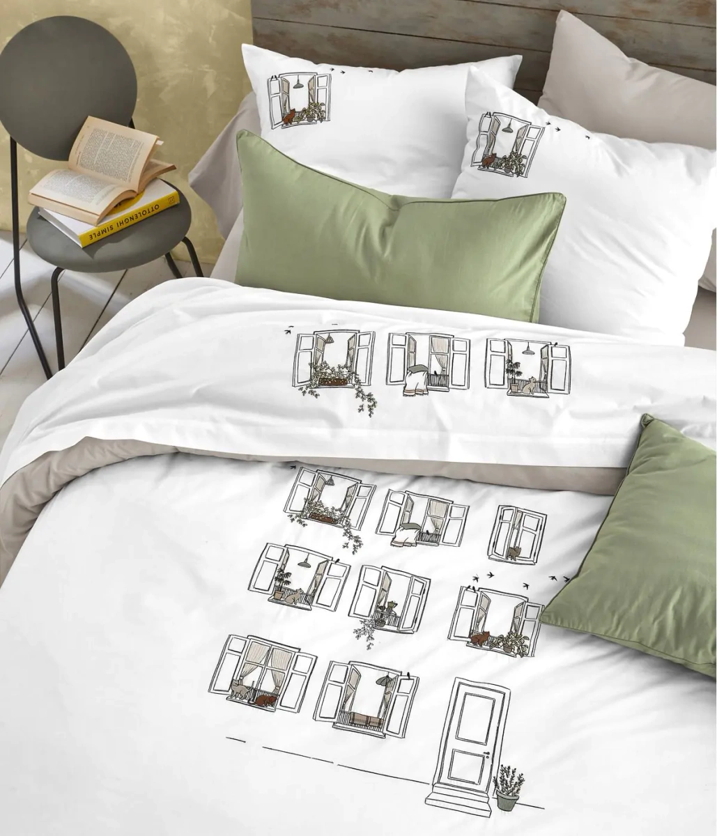 Pościel Bonjour przedstawia swobodną, radosną prostotę codzienności wyhaftowaną na bawełnianym perkalu w kolorze mascarpone.