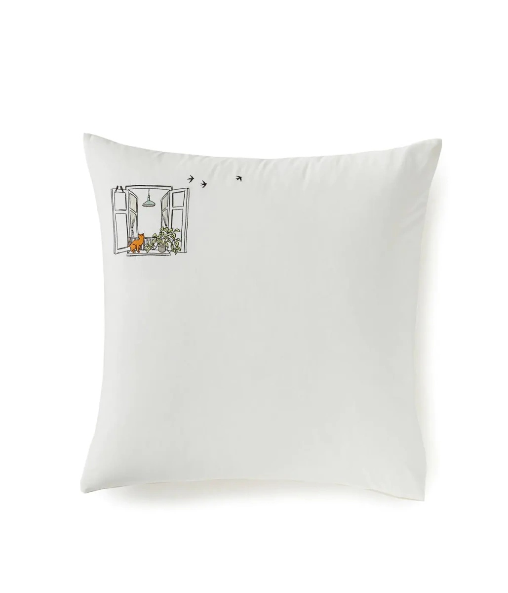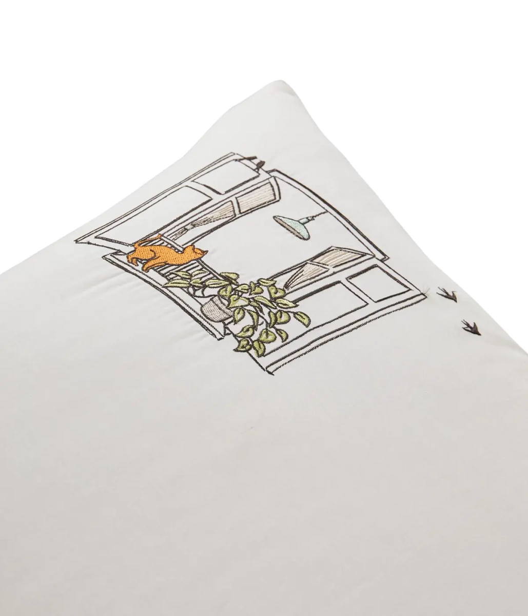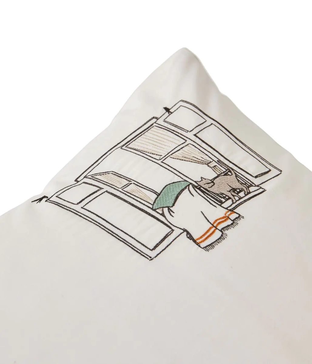 Pościel Bonjour przedstawia swobodną, radosną prostotę codzienności wyhaftowaną na bawełnianym perkalu w kolorze mascarpone.
