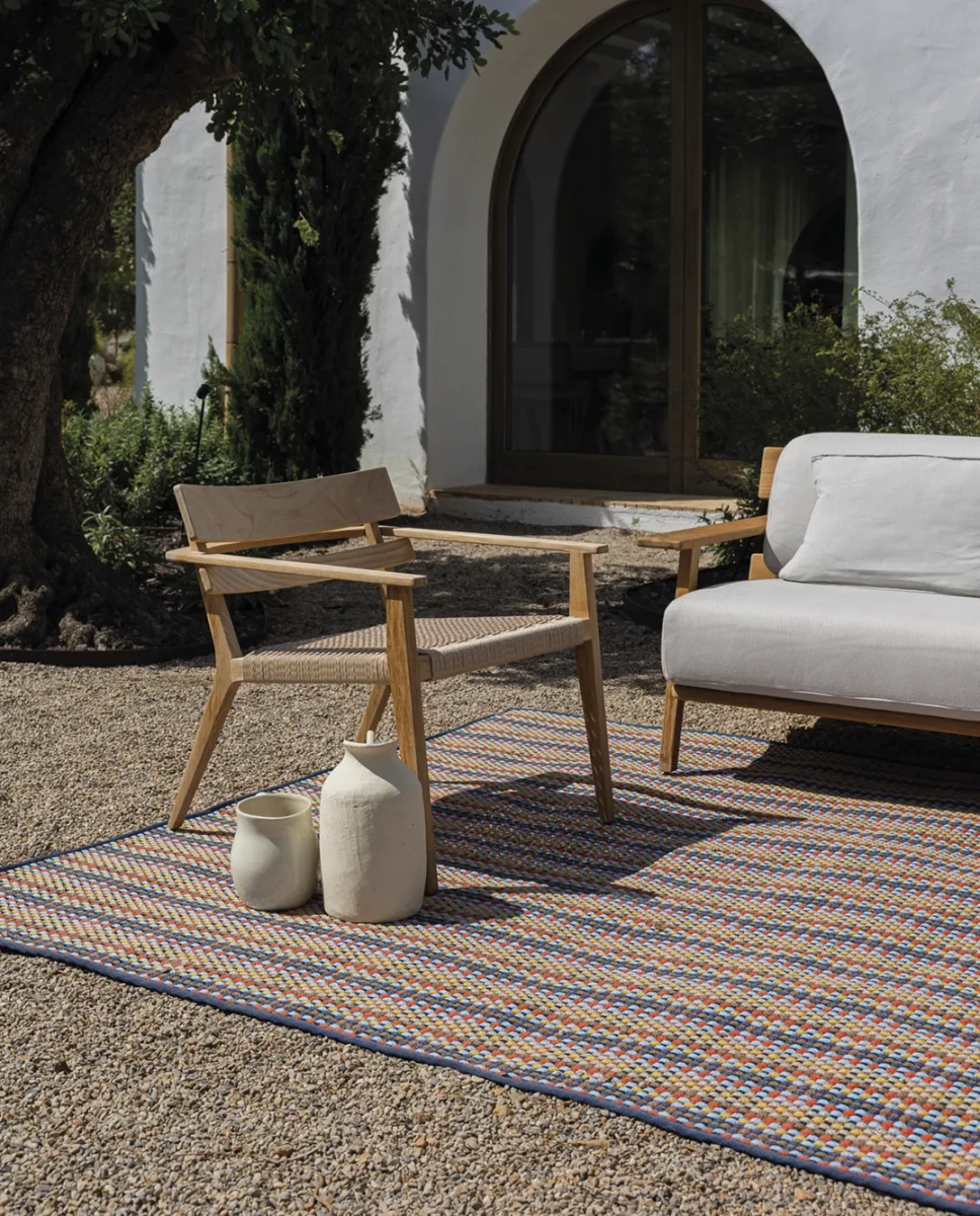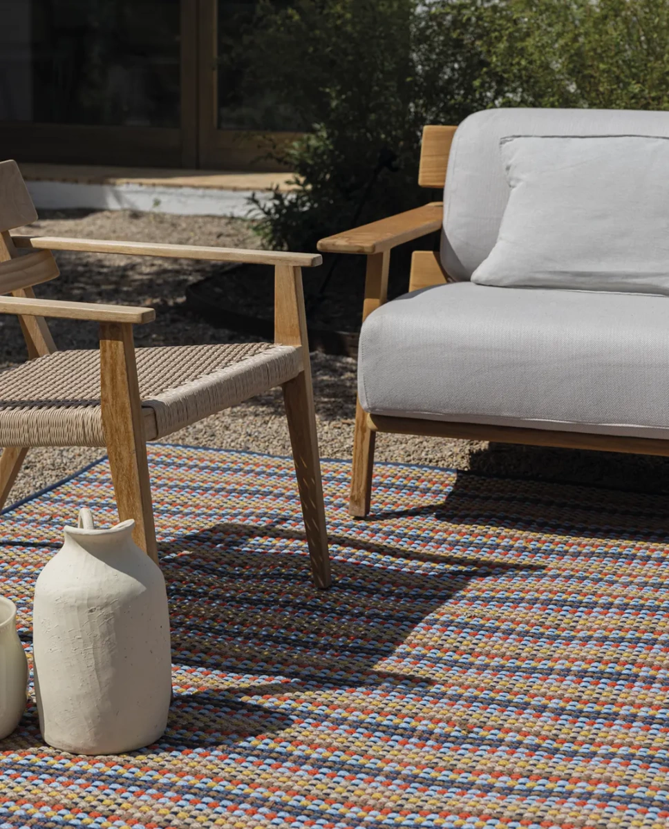 Chcesz, by Twój taras lub salon opowiadał historię? Dywan zewnętrzny Rols Strata 04 pod wymiar z kolekcji Strata to hołd dla piękna Ziemi. Tkany z przetworzonych butelek PET na płaskich krosnach, łączy artystyczne wzory z ekologiczną misją. Idealny na tarasy, patia czy wnętrza, jest odporny na słońce i wodę. Dostępny w szerokościach do 3 m, ten dywan pod wymiar to dzieło, które ożywi każdą przestrzeń.