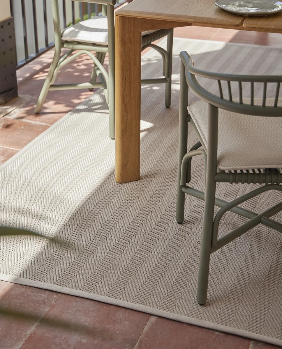 Dzięki dywanowi Rols Maya Gradient Oat odpady zamieniają się w skarb – PET z recyklingu butelek plastikowych staje się dywanem, który jest ekologicznym manifestem. Technika Wilton, znana z precyzji, pozwala na stworzenie wzoru herringbone, który jest jak pomost między naturą a nowoczesnością, gotowy, by zdobić zarówno Twój taras, jak i salon.