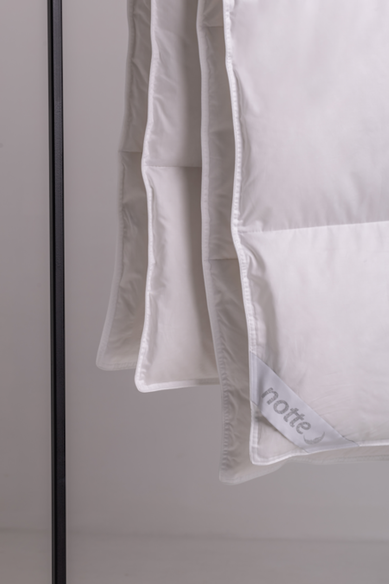 Notte Luna to kolekcja najwyższej jakości. Powłoka jest wykonana z precyzyjnie plecionej, czystej satyny bawełnianej o lśniąco białym kolorze, obszytej srebrną lamówką odpowiadającej księżycowej poświacie. Kołdry mają konstrukcję kasetonową, wypełnione są 100% gęsim puchem z Polski, w kolorze białym. Poduszki są trzy komorowe. Dają miękkie i sprężyste podparcie.