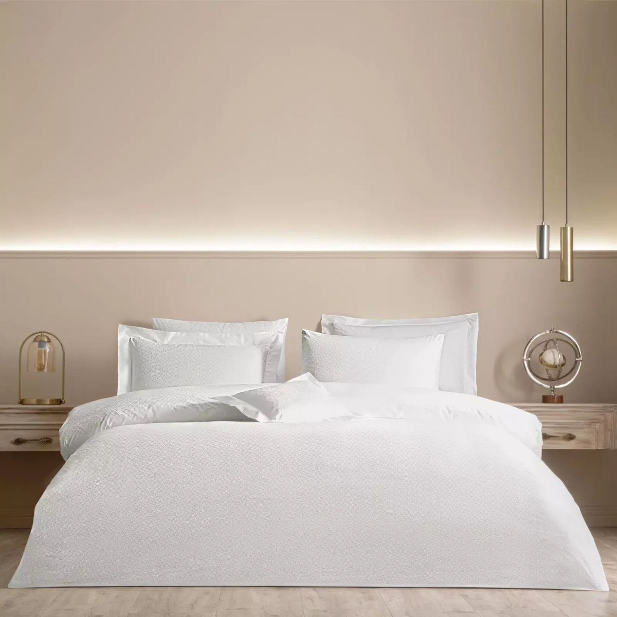 W przypadku modelu Davillo Grey Valeron wykorzystuje żakard z bawełny 100% o gęstości 310 TC, ze zmiennym, atłasowym splotem tworzącym drobny, geometryczny motyw. Dzięki temu wzór nie jest nadrukowany, lecz „wpleciony” w samą tkaninę, więc nie ściera się i nie blaknie nawet po wielu praniach.