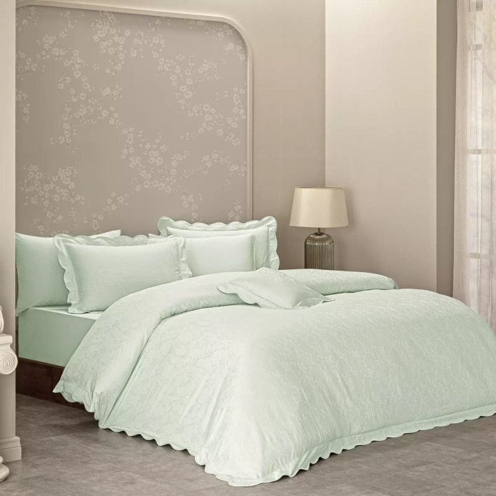 Komplet pościeli żakardowej Valeron Alien Mint to bardzo jasna, mleczno‑miętowa pościel, w której delikatny wzór ton w ton subtelnie wyłania się z gładkiej, lekko połyskującej powierzchni tkaniny.