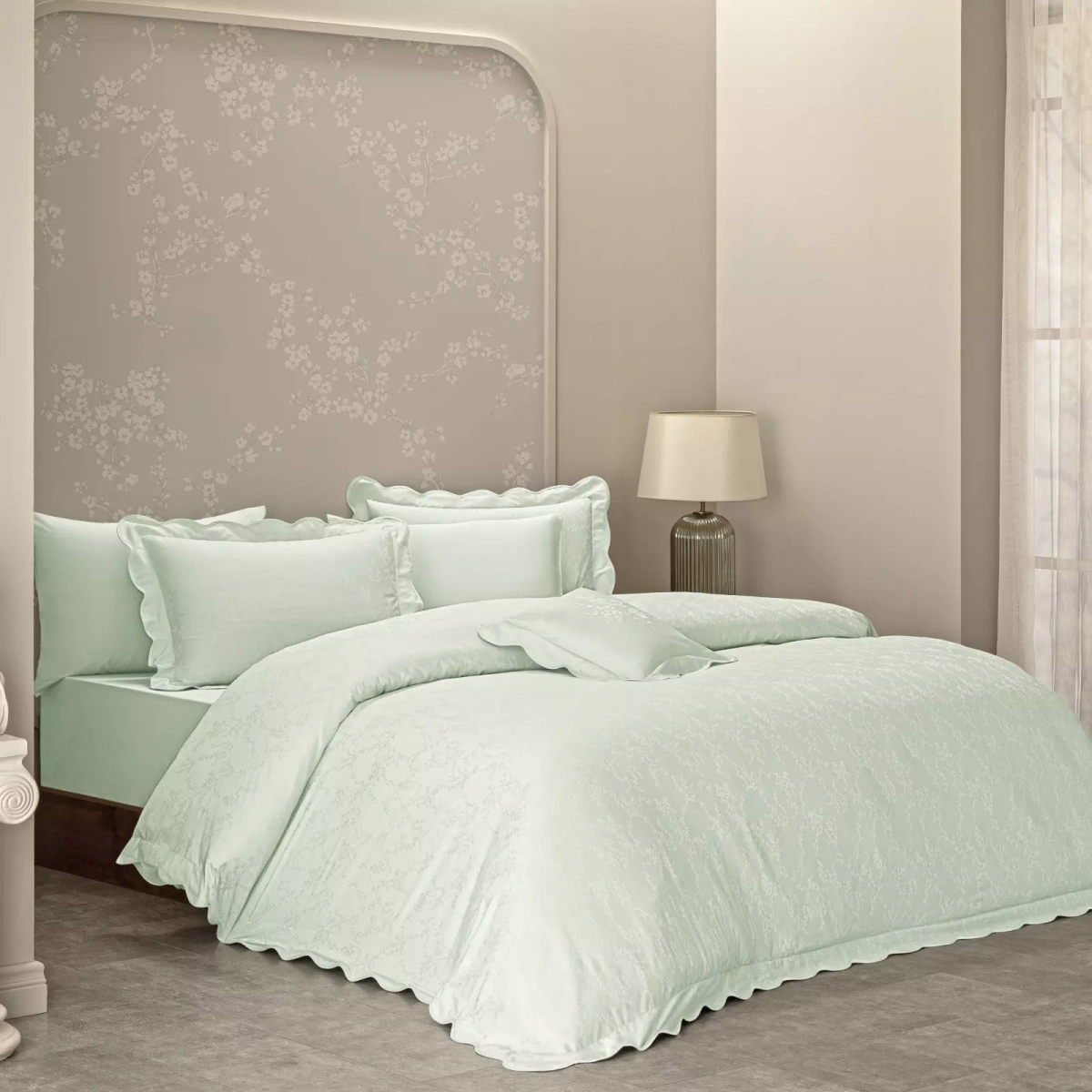 Pastelowa mięta w połączeniu z żakardowym rysunkiem daje wrażenie lekkiej, tekstylnej mgiełki: wzór nie dominuje, tylko zmiękcza jednolitą płaszczyznę tkaniny i nadaje jej subtelnie romantyczny charakter. Dzięki temu komplet wygląda bardzo spokojnie, niemal monochromatycznie, a jednocześnie wyraźnie różni się od całkowicie gładkiej pościeli – to elegancja oparta na fakturze, a nie kolorystycznym kontraście.
