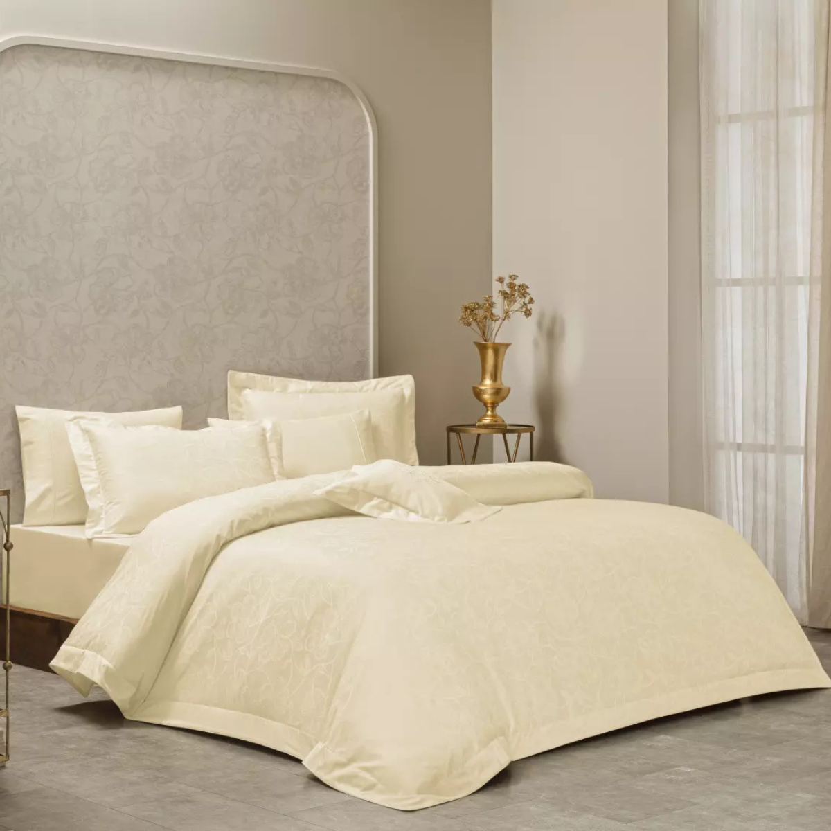 Amaouge Ecru powstaje z gładko barwionej tkaniny jacquard 100% bawełny o wysokiej gęstości, porównywalnej z liniami 300–310 TC stosowanymi w kolekcjach premium Valeron. Taki splot zapewnia jednocześnie miękkość, wytrzymałość i delikatny, satynowy połysk – materiał przyjemnie otula ciało, dobrze oddycha i nie prześwituje, dzięki czemu łóżko wygląda pełnie, a pościel układa się w równą, elegancką powierzchnię.