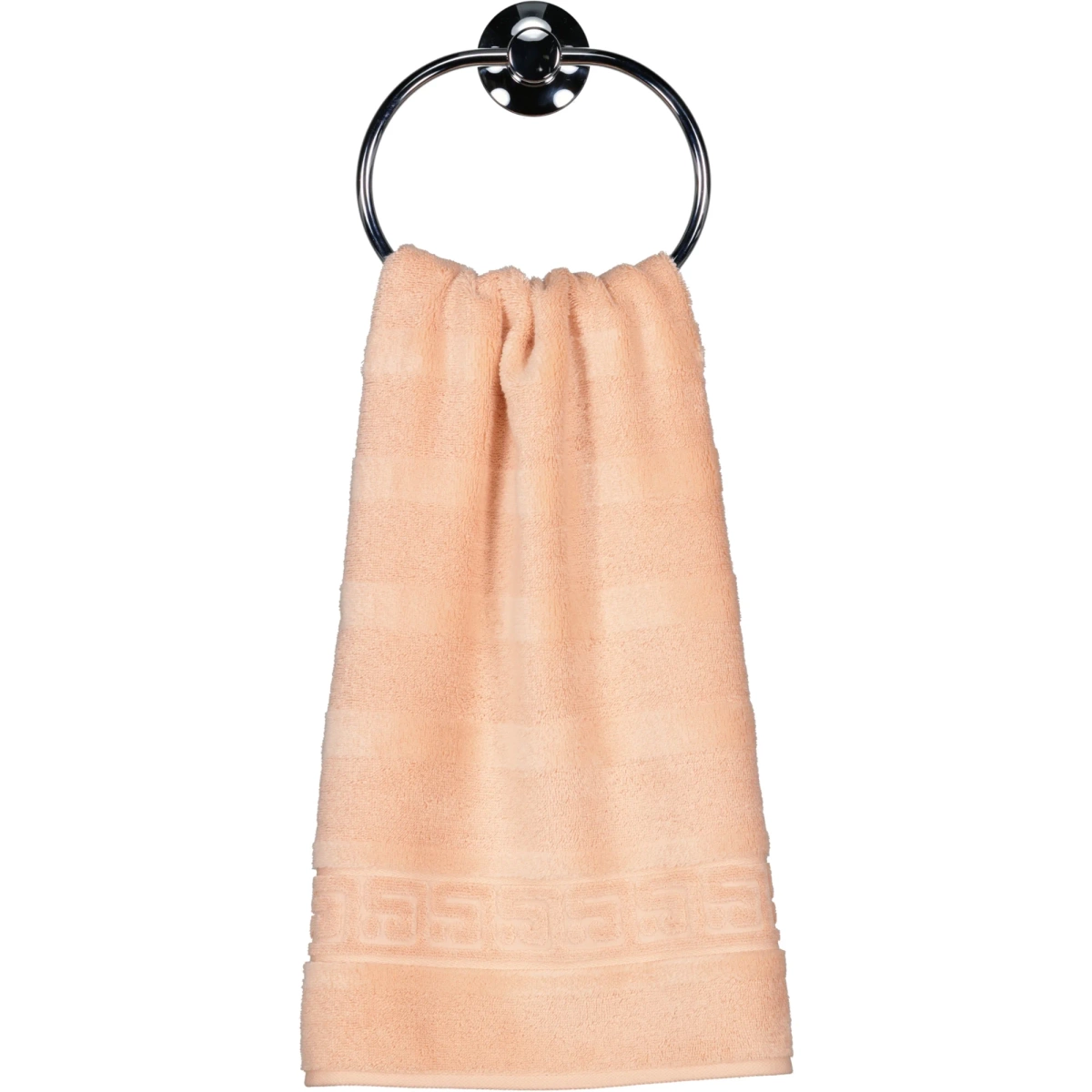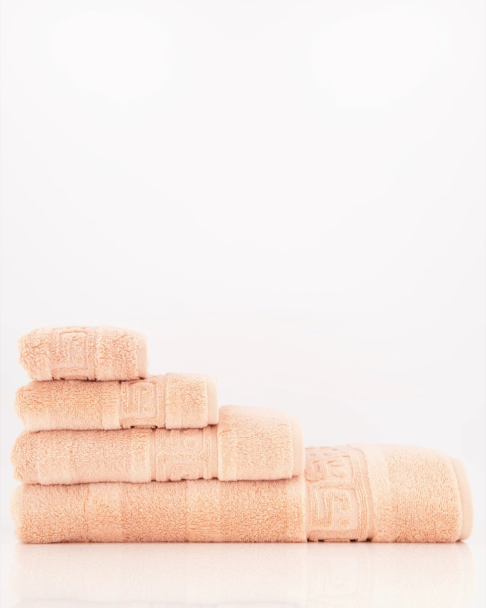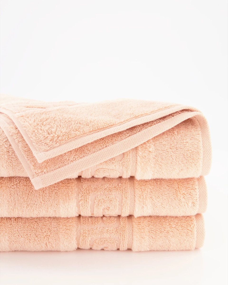 Bordiura Greek biegnąca wzdłuż krawędzi nadaje całości charakteru i podkreśla równe linie ręcznika. Starannie wykonane obszycia utrzymują brzegi w nienagannym stanie, a wszyty uchwyt ułatwia codzienne zawieszanie i porządkowanie przestrzeni. Gładka, jednolita powierzchnia frotte prezentuje się estetycznie na wieszaku i w ułożonych stosach na półce.