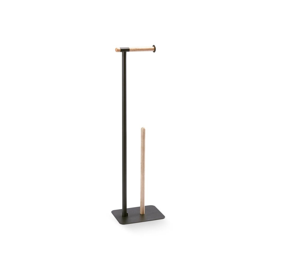 Stylowy stojak na papier toaletowy, wykonany z porcelany z elementami ze stali, kauczuku i drewna bukowego.