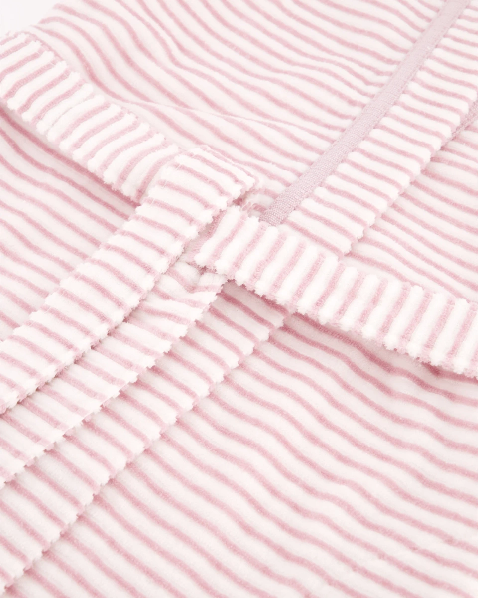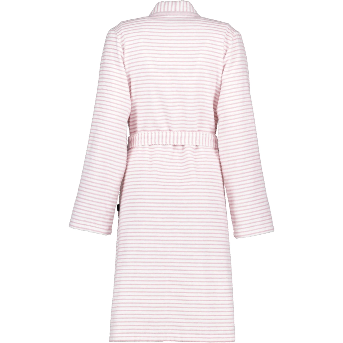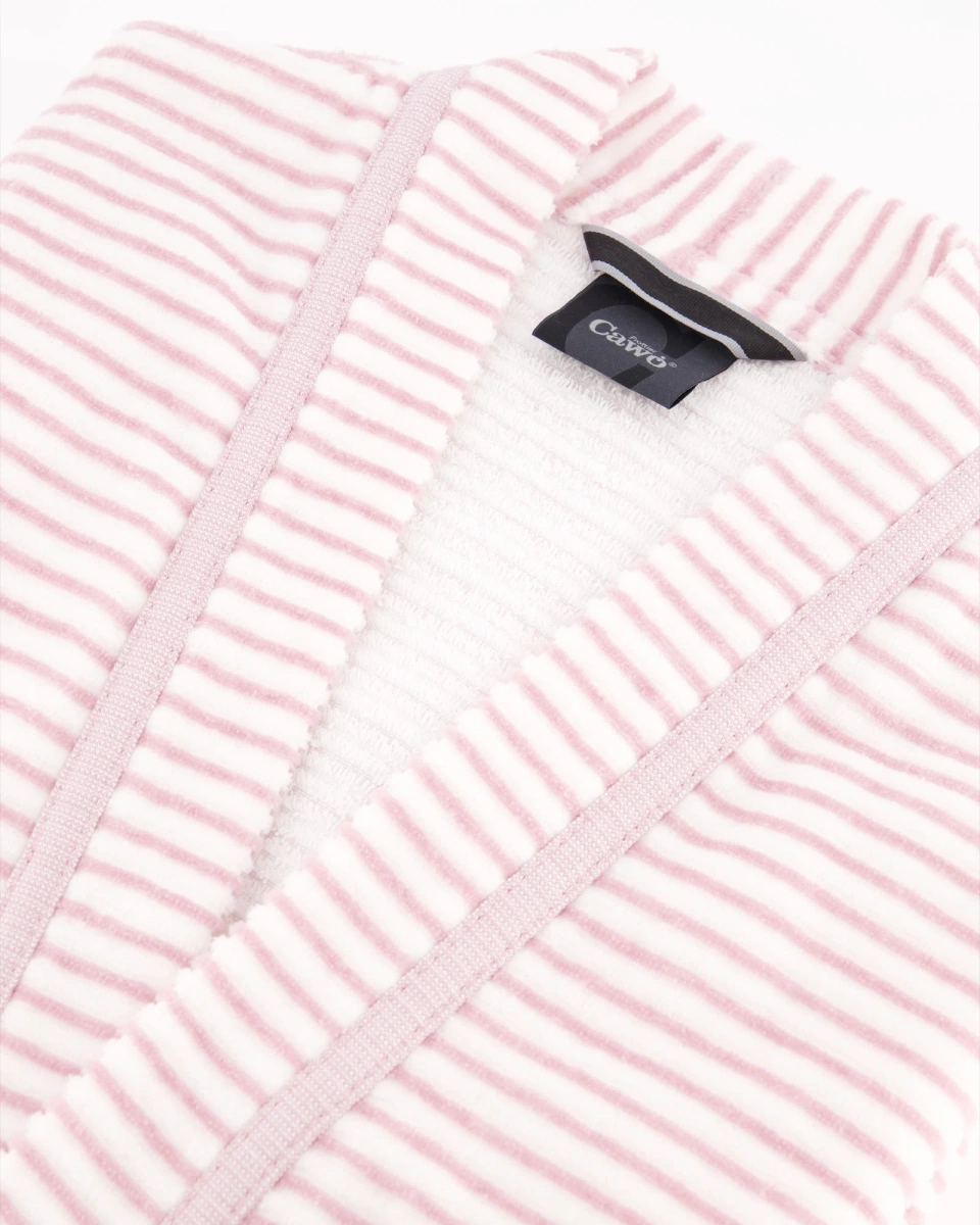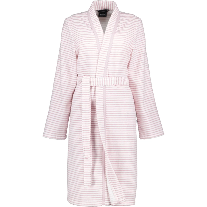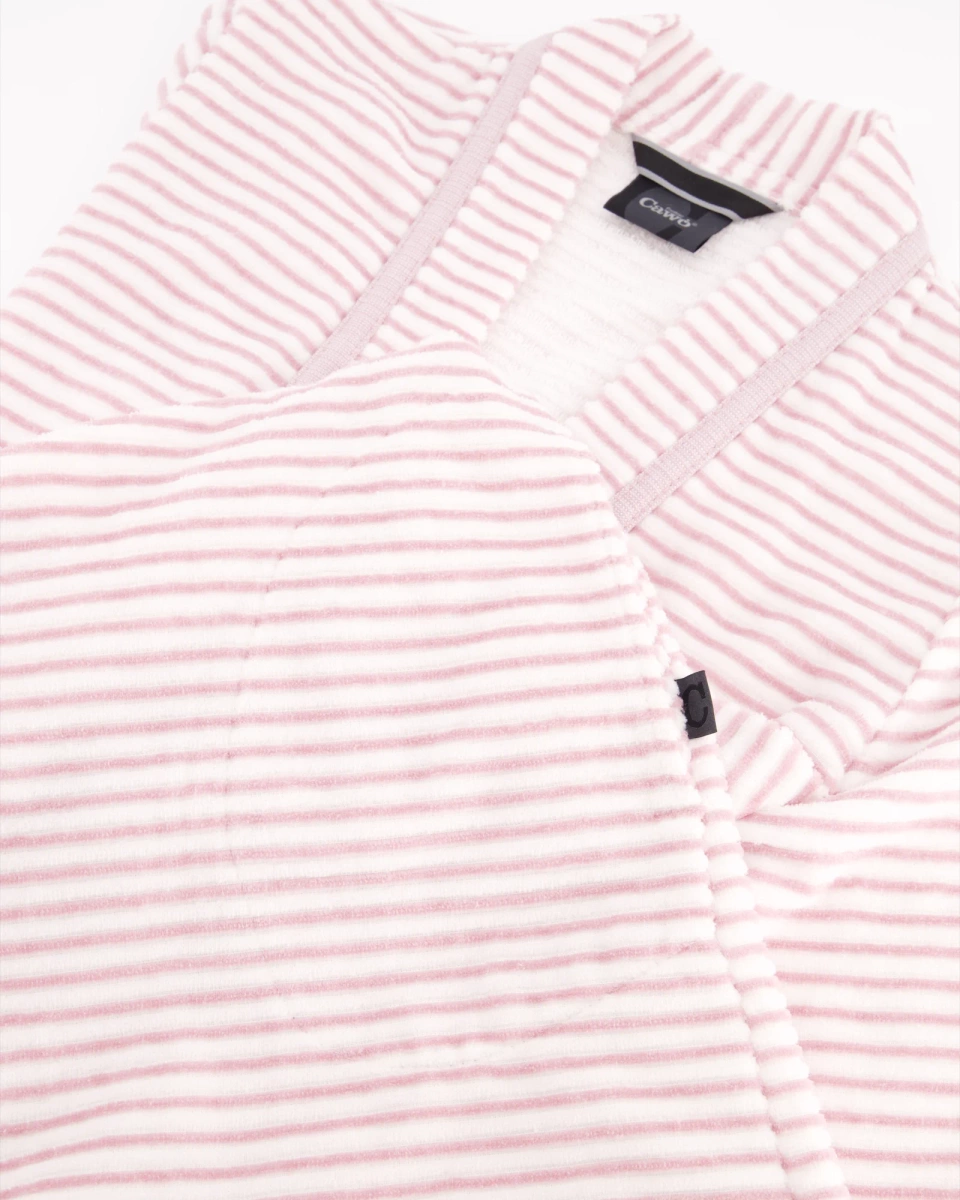 Szlafrok damski Cawo Structure w wersji kimono krótkie to propozycja dla pań ceniących sobie połączenie wygody, designerskiego fasonu oraz wyjątkowej jakości materiału. Ten model marki Cawö zachwyca subtelnym wzorem w paseczki o fakturze wypukłości i wgłębień, które tworzą efekt struktury i delikatnie podkreślają nowoczesny charakter tekstyliów. Fason kimono, lekko skrócony i delikatnie taliowany, sprawia, że szlafrok wspaniale układa się na sylwetce, jest przewiewny, lekki i bardzo kobiecy – idealny do porannego rytuału, wieczornego relaksu, na basen czy do strefy spa.