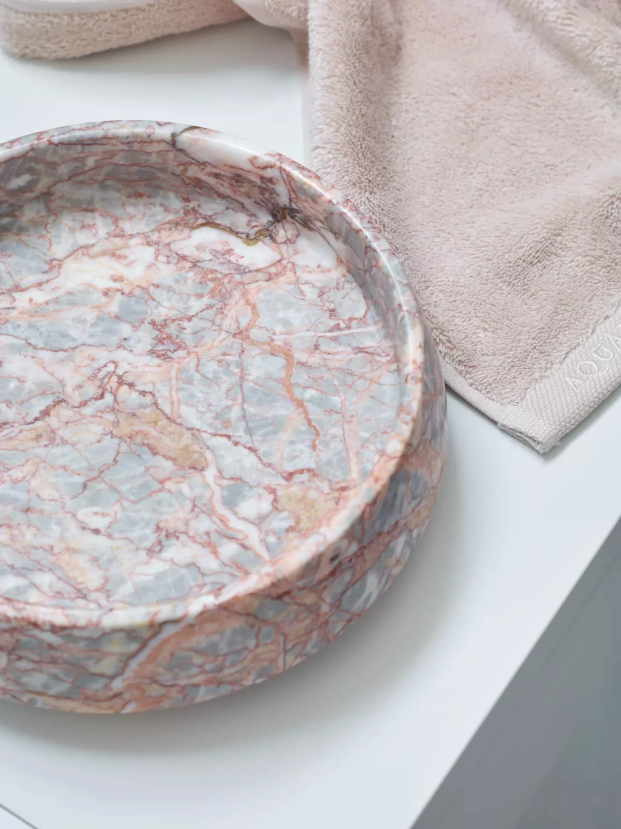 Taca Aquanova Orion Almond to luksusowy dodatek łazienkowy, który łączy ręczne wykonanie z unikatowym wzornictwem naturalnego kamienia. Pochodzi z prestiżowej kolekcji Orion, wyróżniającej się elegancką, zwężającą się ku dołowi formą. Dzięki wysokości 6 cm i średnicy 25 cm, taca może pełnić funkcję zarówno praktyczną, jak i dekoracyjną – świetnie sprawdzi się jako misa na kosmetyki, biżuterię czy świece zapachowe.