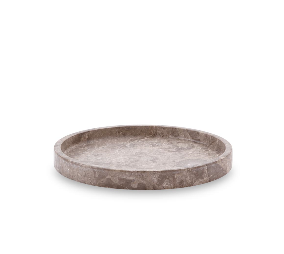 Piękna taca o okrągłym kształcie i barwie naturalnego marmuru (beżowo-brązowej połączonej z innymi odcieniami). Pomoże w zachowaniu porządku w różnych łazienkowych drobiazgach lub będzie świetnym miejscem na np. zapachowe suszki. Stworzona z niezwykłą precyzją i dbałością o każdy, nawet najmniejszy szczegół. Idealnie komponuje się z innymi elementami kolekcji CONOR.