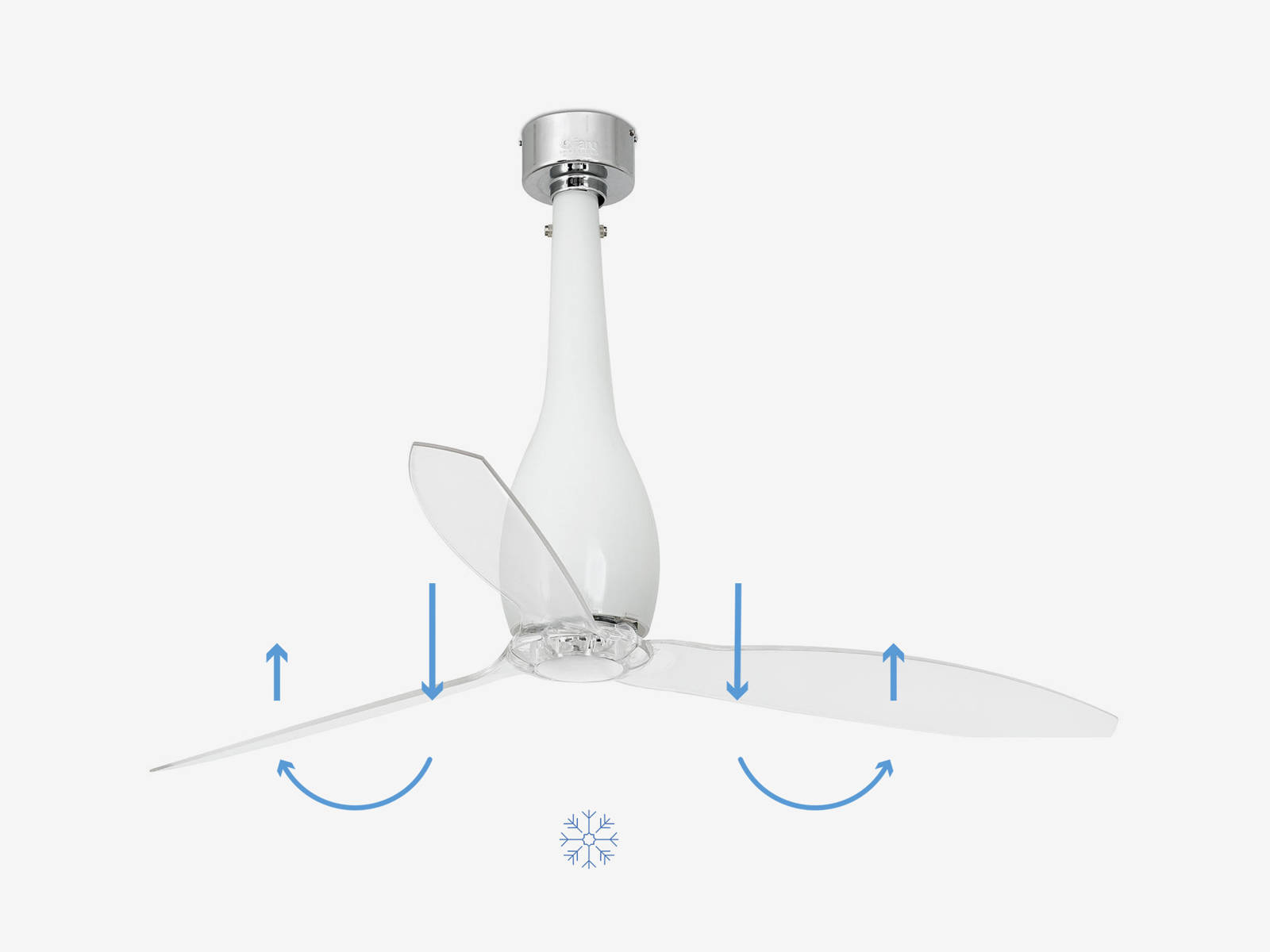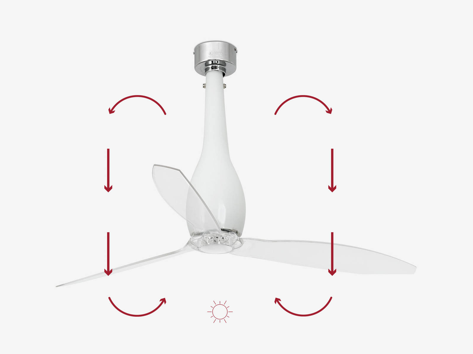 Eterfan to wentylator sufitowy w nowoczesnym, przemysłowym stylu. Doskonale nada się do wentylacji pomieszczeń o powierzchni od 13 m² do 17,6 m². Posiada energooszczędny silnik DC i 6 regulowanych prędkości. Błyszcząca biała barwa, transparentne łopatki oraz funkcja odwracania kierunku obrotów, dzięki czemu możesz go używać również zimą, poprawiając efektywność systemu ogrzewania. Aktywowany za pomocą dołączonego pilota zdalnego sterowania.